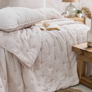 Quilted double-face bedspread with hand-stitched woven patterns